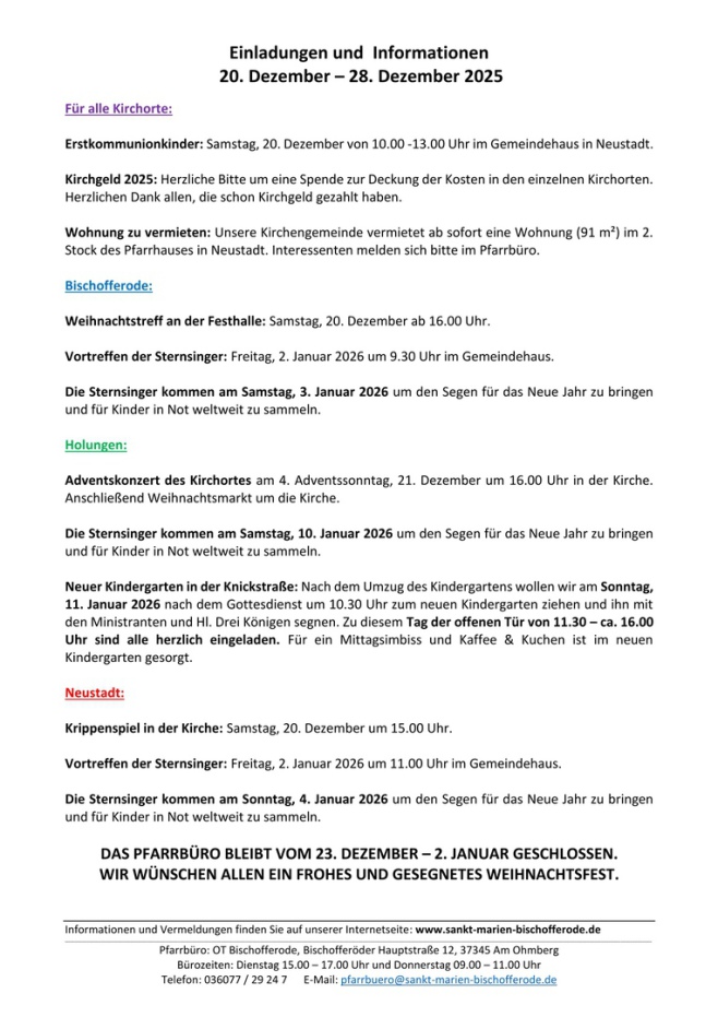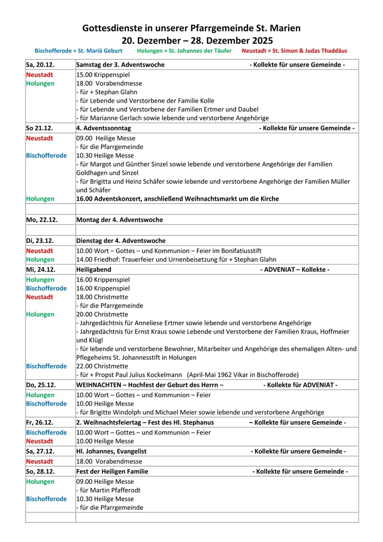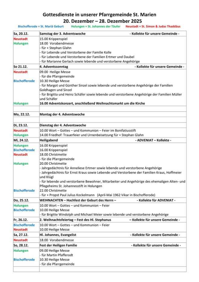 Gottesdienstordnung & Vermeldung vom: 20.12.-28.12.2025