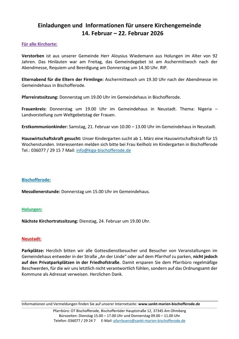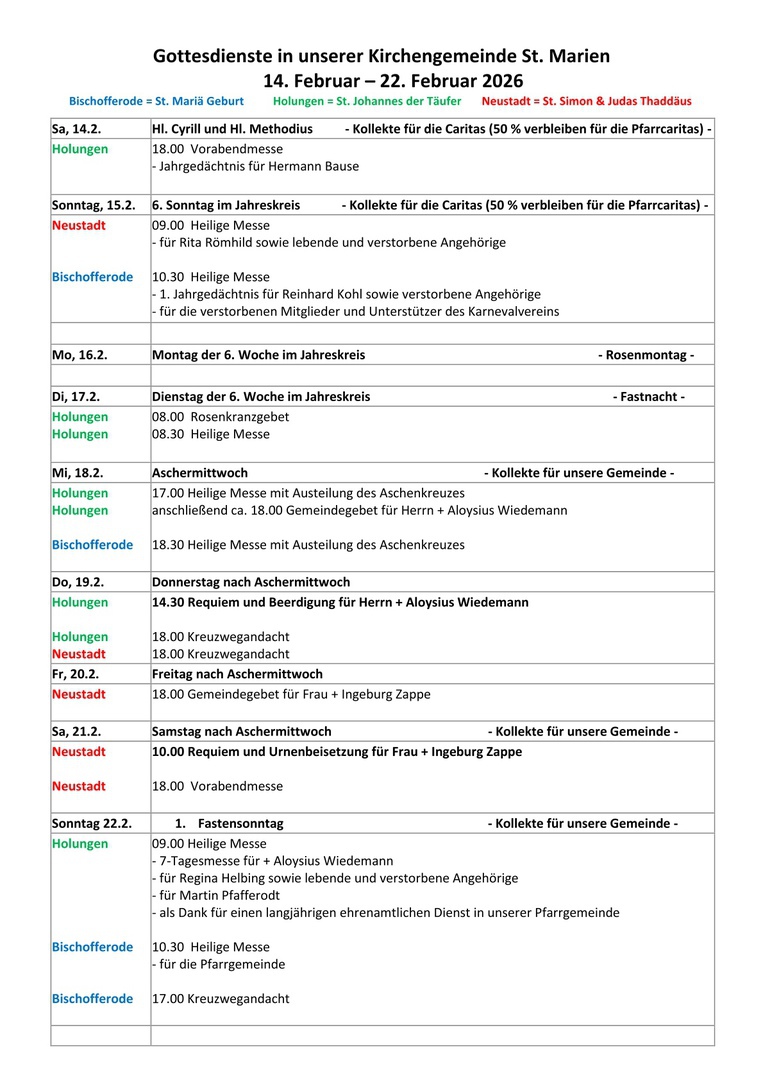 Gottesdienstordnung & Vermeldung vom: 14.02.-22.02.2026