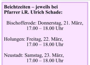 Das Sakrament der BEICHTE gehört als Feier der Versöhnung mit Gott und den Menschen zu unserem Christenleben. Sie ist das Sakrament, in dem Gott einen Neuanfang ermöglicht. Dafür bieten wir regelmäßige Beichtgelegenheiten an. In der Advent- und Fastenzeit gibt es auch extra Beichtzeiten mit fremden Beichtvätern. Beichte beinhaltet Besinnung, Gespräch mit einem Priester und Empfang des Sakramentes der Versöhnung. Im Gespräch mit dem Priester, der an das Beichtgeheimnis gebunden ist, sagt Gott dem Menschen, der seine Schuld ausspricht, zu: Du darfst einen Neuanfang wagen. Deine Schuld ist vergeben. Du bist in der Lage, dein Leben zu ändern. Diese Zusage kann immer neu wiederholt werden, da ja Neuanfänge nicht immer gelingen.