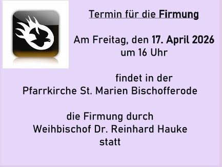 Auch Erwachsene sind eingeladen, das Firmsakrament zu empfangen. Hier erfolgt eine gesonderte Vorbereitung. Wer als Erwachsener Interesse an der Firmung hat, spricht bitte einen Gesprächs-termin mit dem Pfarrer ab.